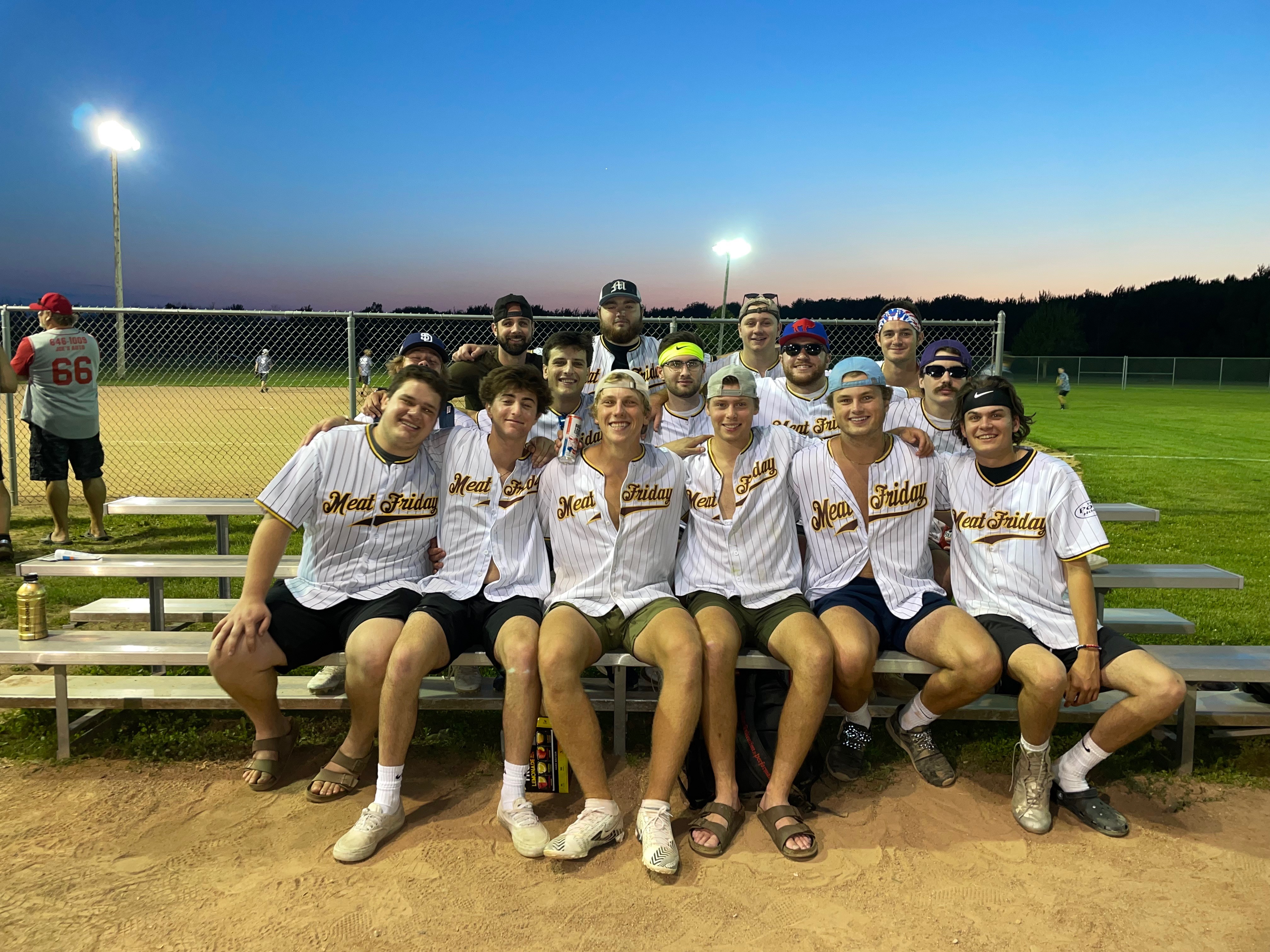 We’ve been together for 6 years now we drink blue light 30s before after and pitchers after the games and demolish wings we are your average joe smoes that average 3 wins a season but average the most heart pregame just yelling and being idiots striking out and making 5 errors an inning lose or lose we still booze with blue light Team colors are orange green and white